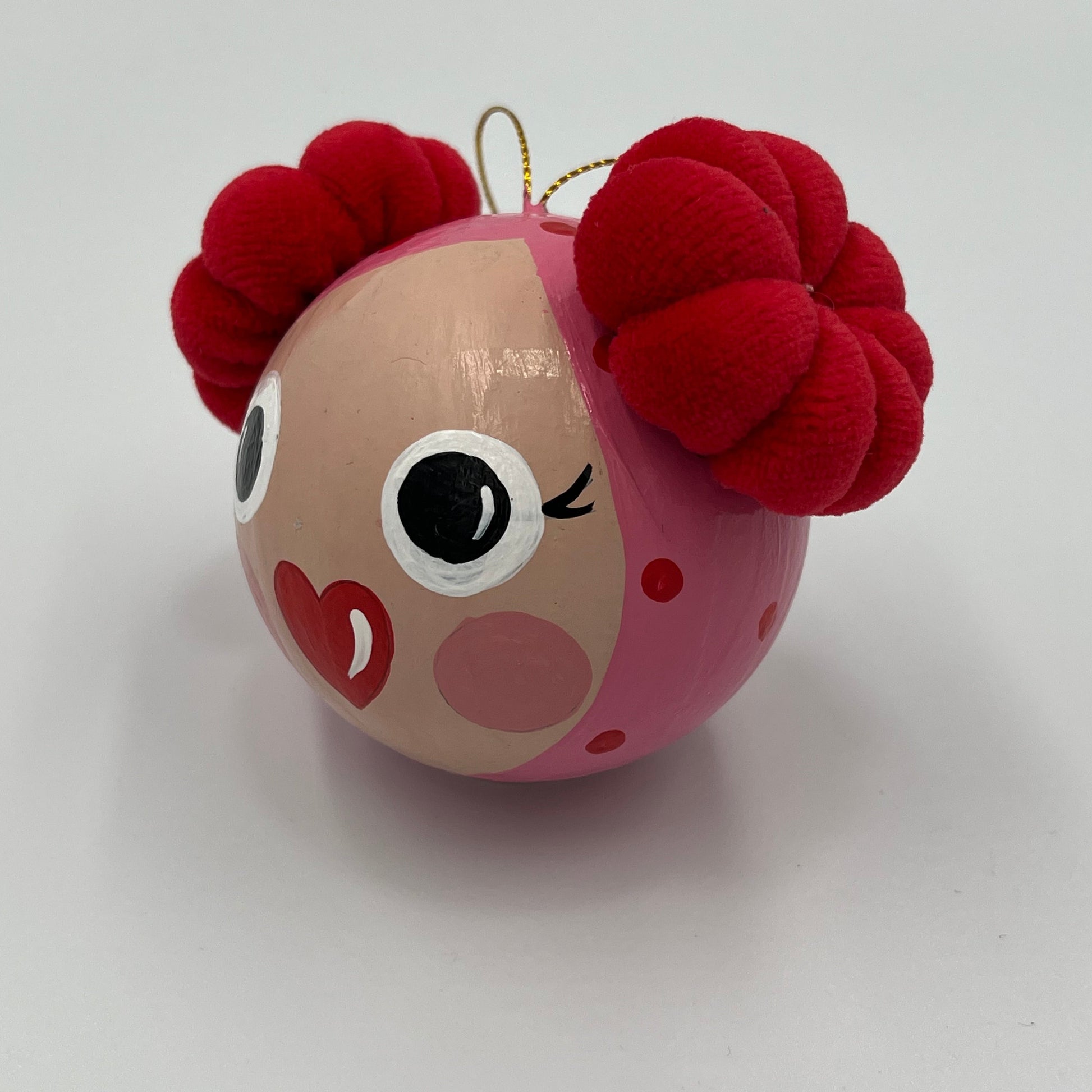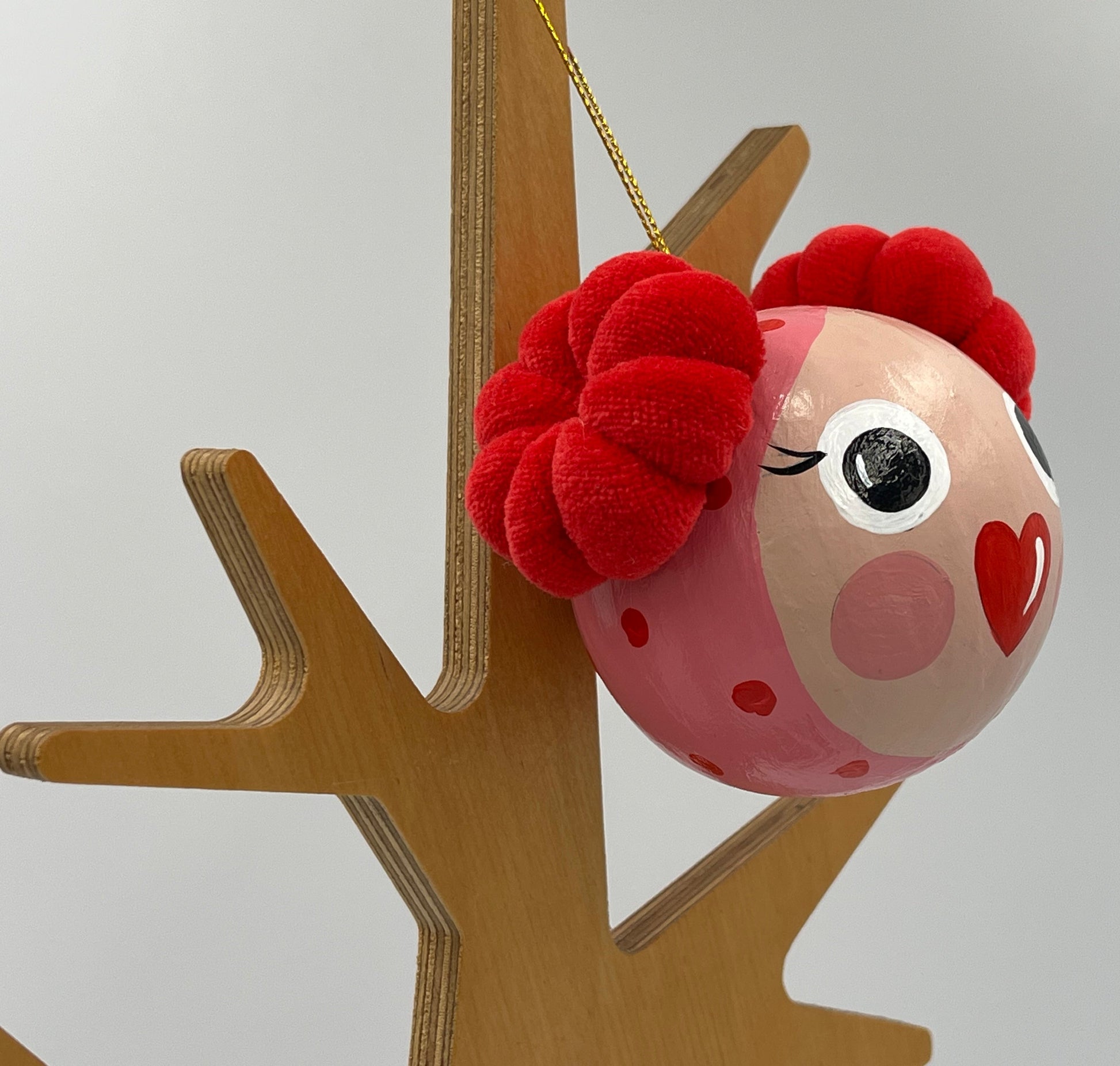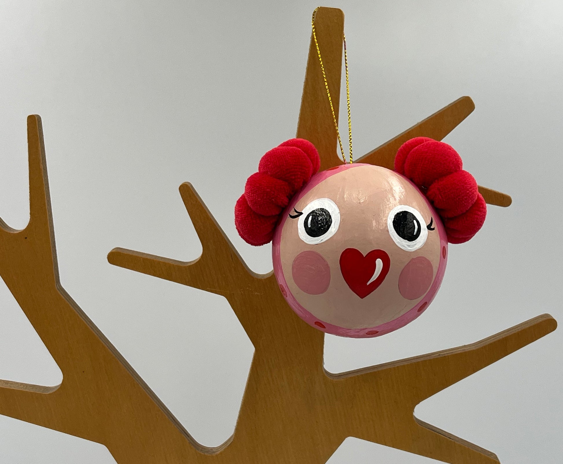 Φέρτε τη μαγεία των Χριστουγέννων στη διακόσμησή σας με αυτή τη ξεχωριστή μπάλα. Το μικρό κοριτσάκι με τα υφασμάτινα κοτσιδάκια μοιάζει να περιμένει τον Άγιο Βασίλη κάτω από το δέντρο, προσθέτοντας μια γλυκιά και νοσταλγική πινελιά στις γιορτές.