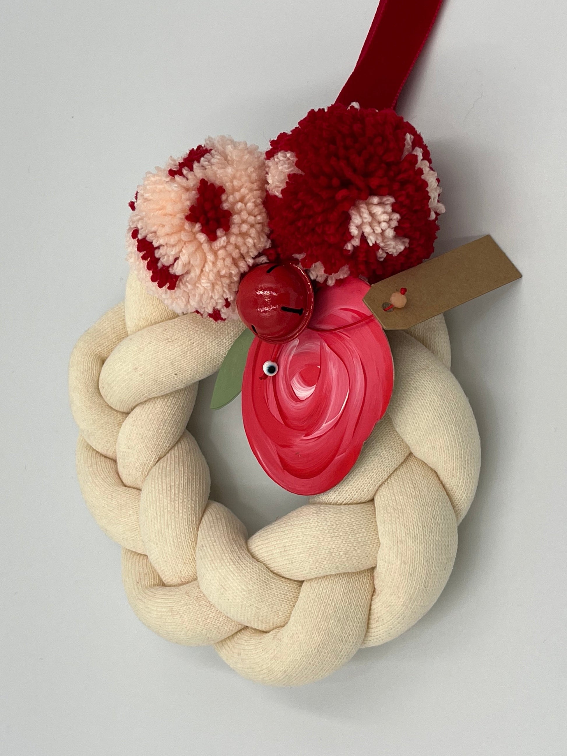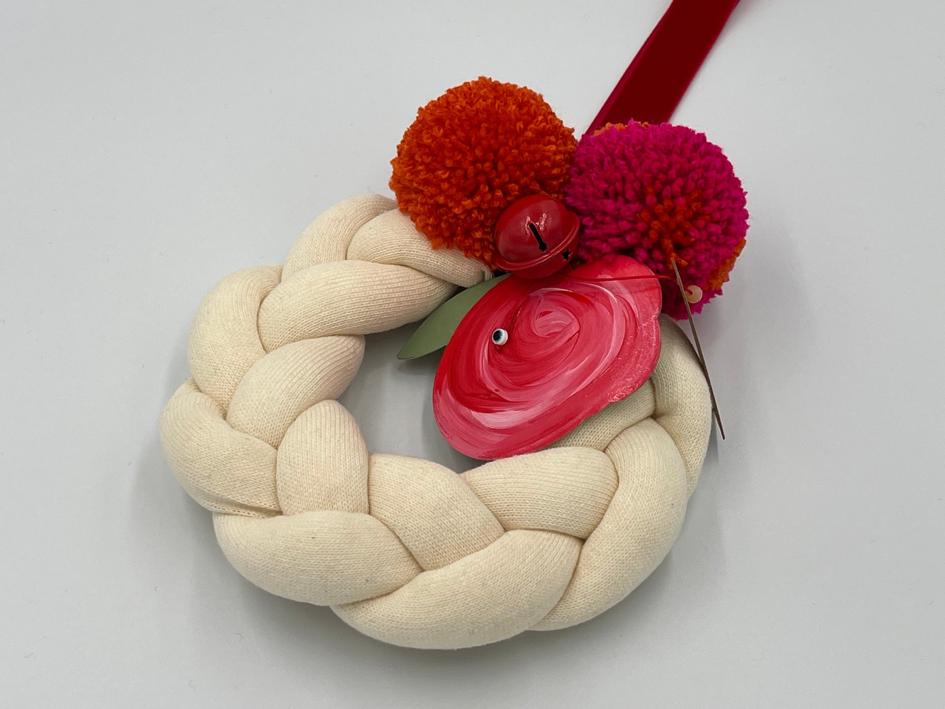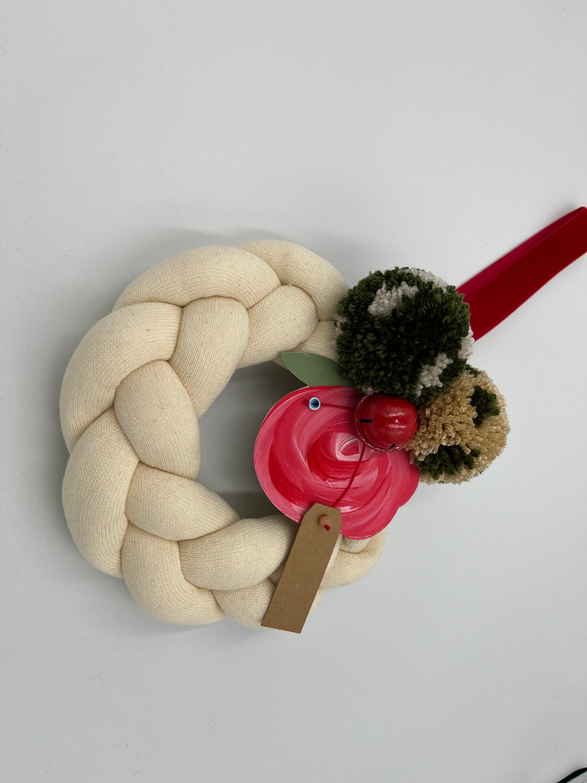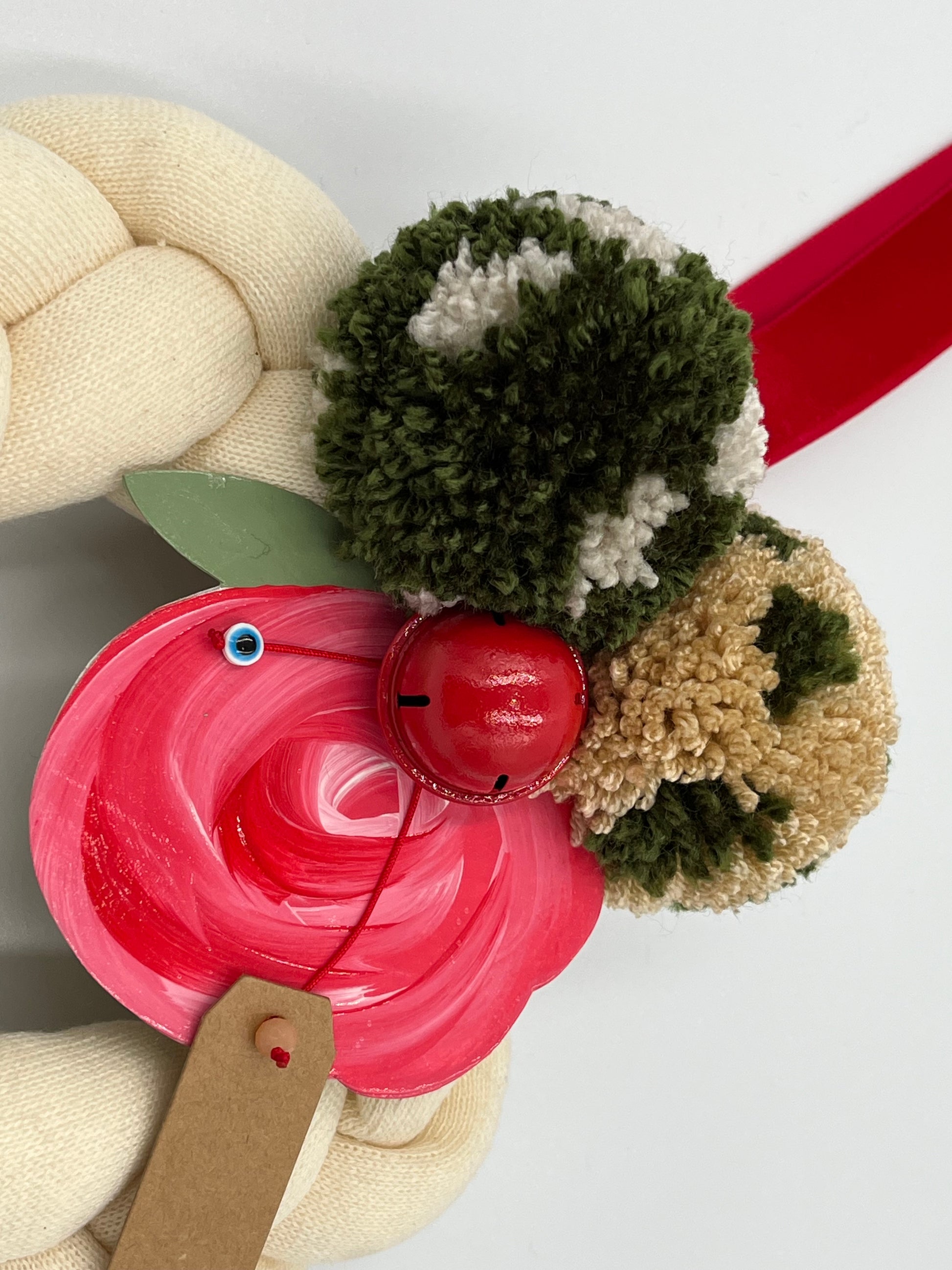 Ένα γούρι‑στεφάνι που παντρεύει την παράδοση με την καλλιτεχνική δημιουργία. Η υφασμάτινη πλεξίδα στολίζεται με βελούδινη κορδέλα και λουλούδι σε μεικτή τεχνική, ενώ η παιχνιδιάρικη ευχή “Φτου... σκόρδα” χαρίζει προστασία και θετική ενέργεια.