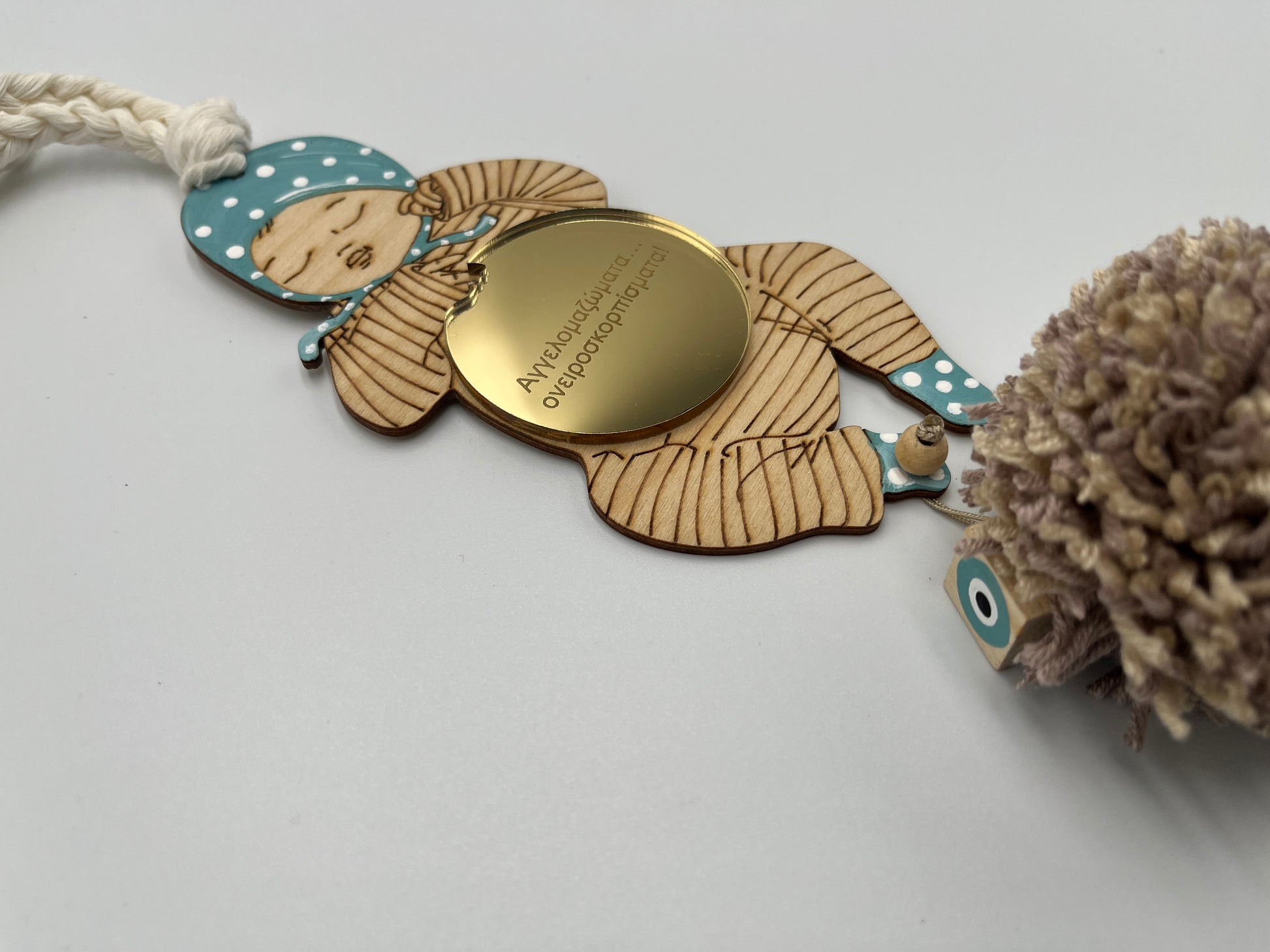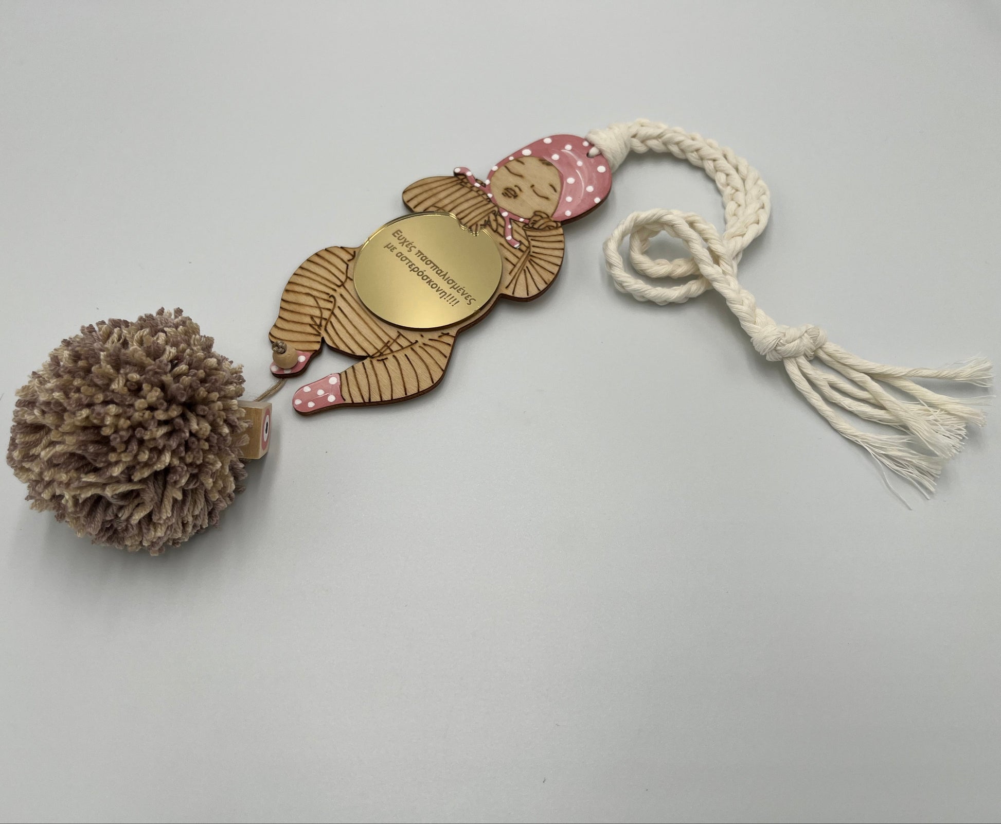 Κρεμαστό μωρό από ξύλο και plexiglass, διακοσμημένο με ματάκι και χειροποίητο πον-πον, γιααίσθηση παλιάς εποχής στον χώρο — σαν παιχνίδι βγαλμένο από vintage κουτί αναμνήσεων.