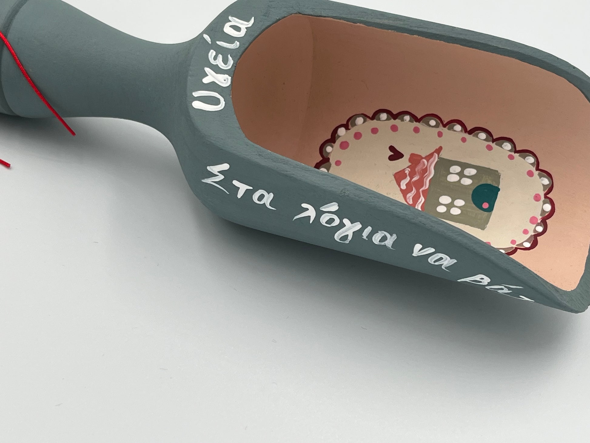 Μια ξύλινη σεσούλα, ζωγραφισμένη στο χέρι με αγάπη, σε τρία χρώματα που φέρνουν γιορτινή αρμονία. Η φράση «Στα λόγια να βάζεις ζάχαρη και στη ζωή αλάτι» γίνεται μικρό μυστικό αισιοδοξίας, ένα δώρο που χαρίζει γλυκύτητα και σοφία σε όσους αγαπάς.