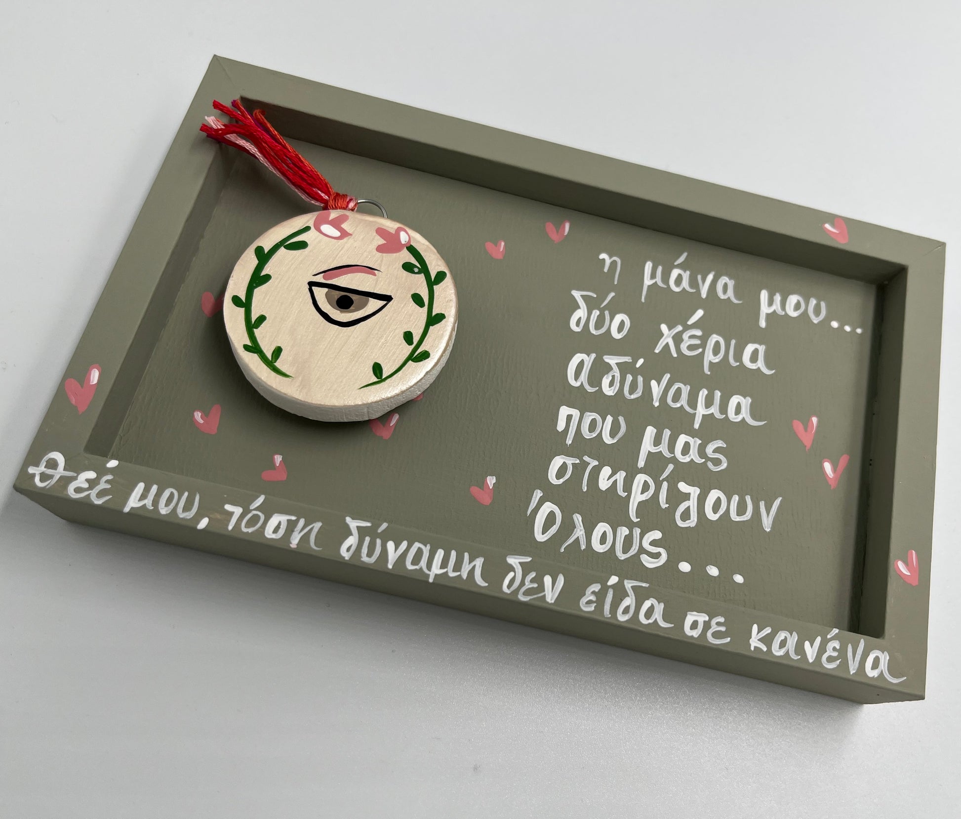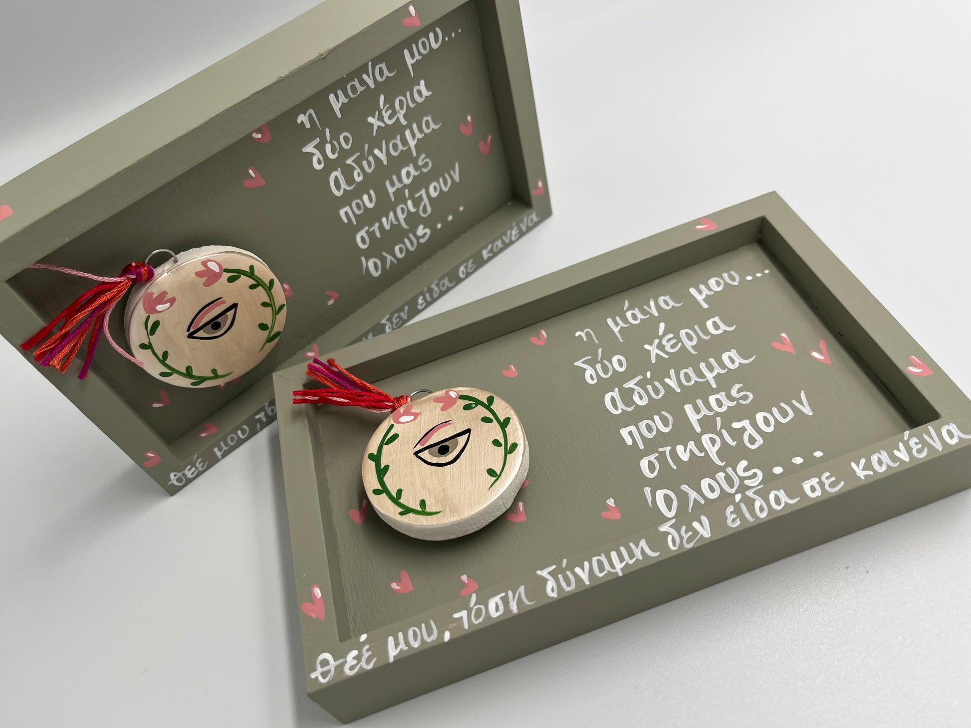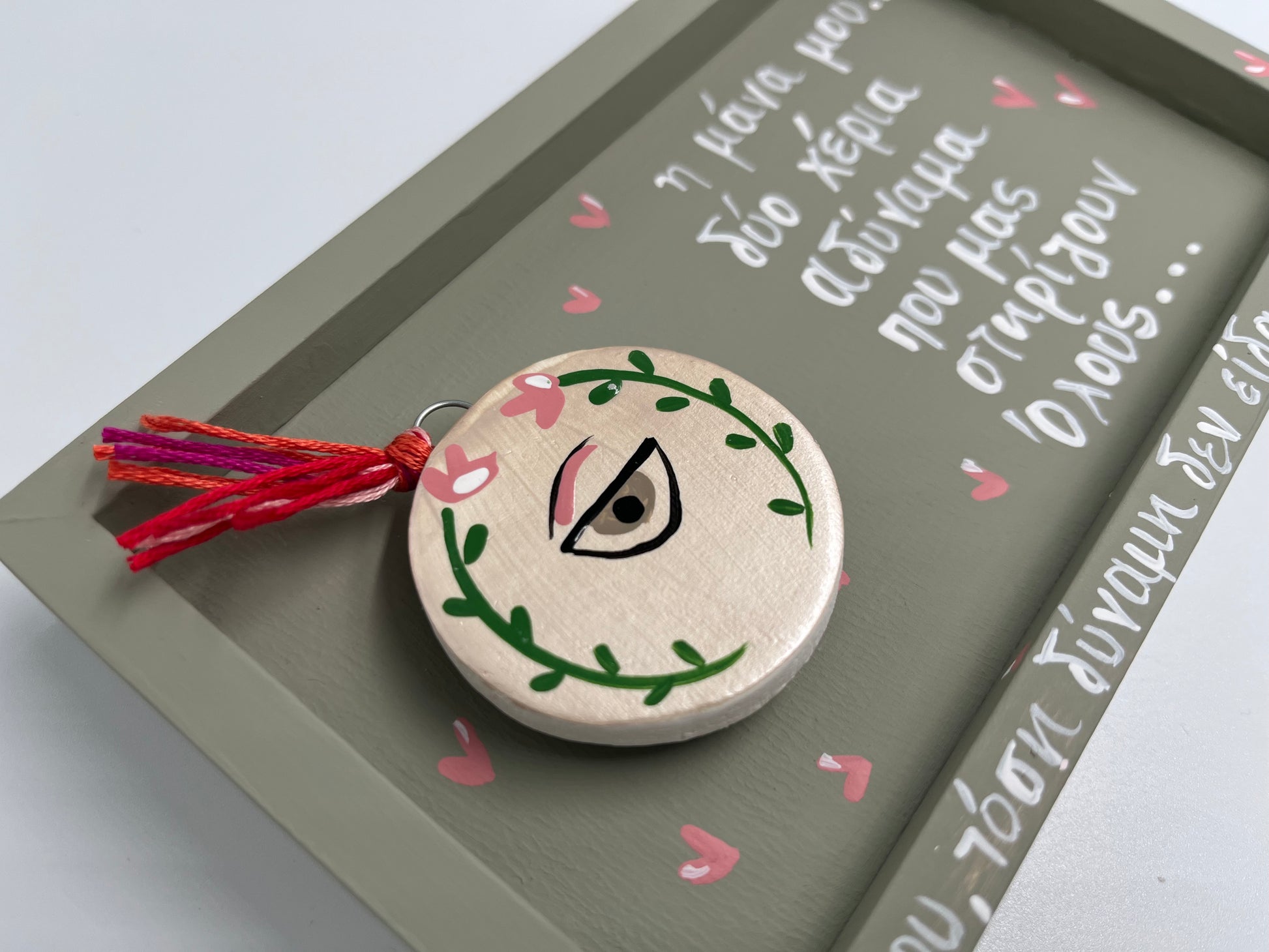 Ένα ξεχωριστό έργο τέχνης φτιαγμένο με αγάπη! Χειροποίητο ξύλινο καδράκι, ζωγραφισμένο στο χέρι με προσοχή στη λεπτομέρεια, που αποπνέει ζεστασιά και φινέτσα. Το πήλινο στοιχείο με το σύμβολο του ματιού προσθέτει μια ιδιαίτερη πινελιά προστασίας και θετικής ενέργειας. Ένα δώρο που εκφράζει ευγνωμοσύνη και αγάπη για τη μητέρα, ιδανικό για να στολίσει τον χώρο της και να της υπενθυμίζει πόσο μοναδική είναι!