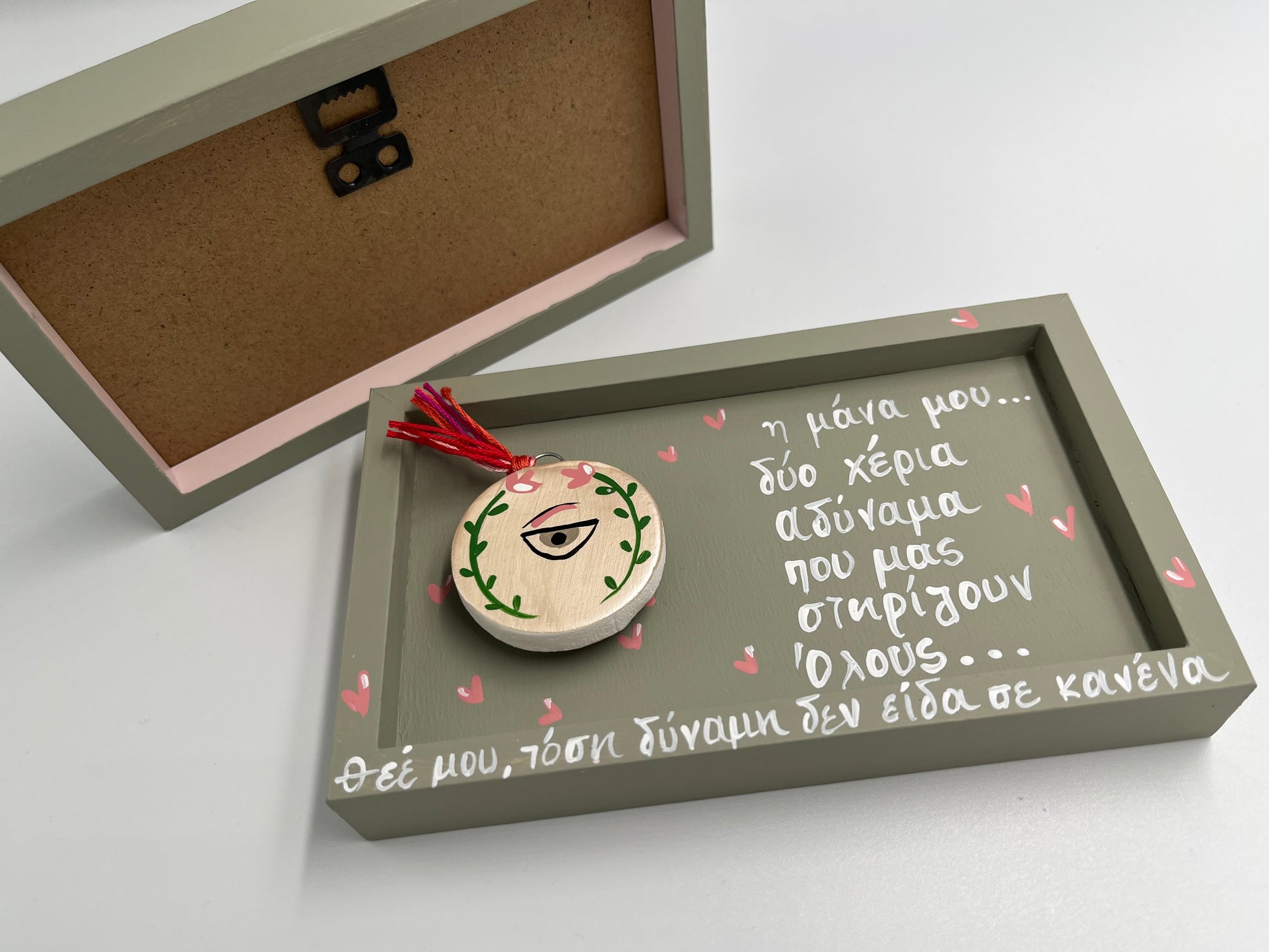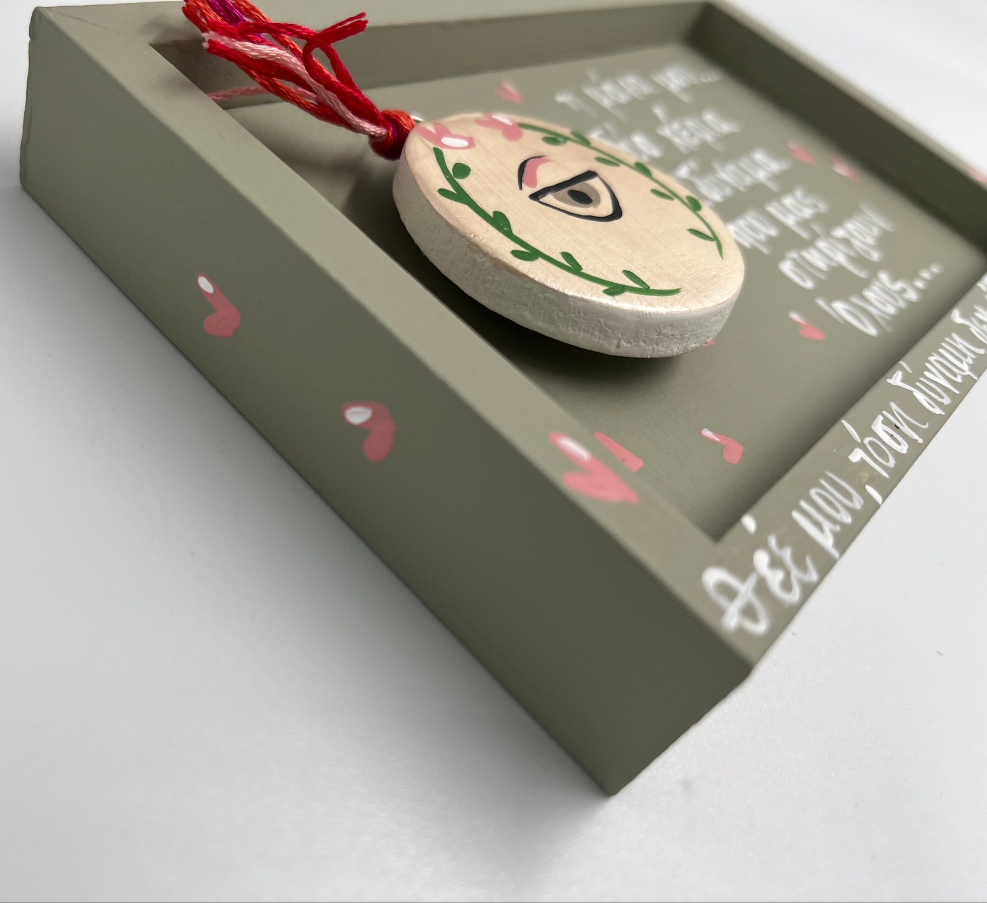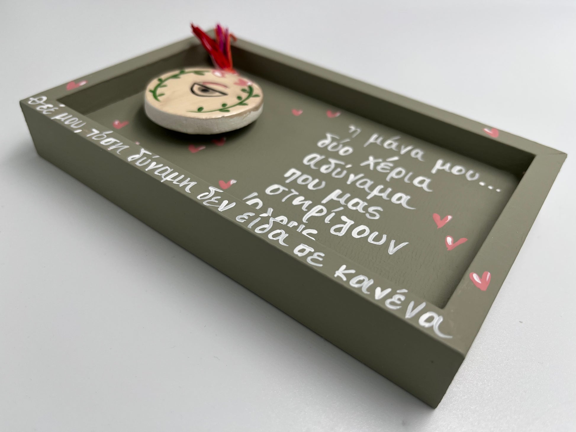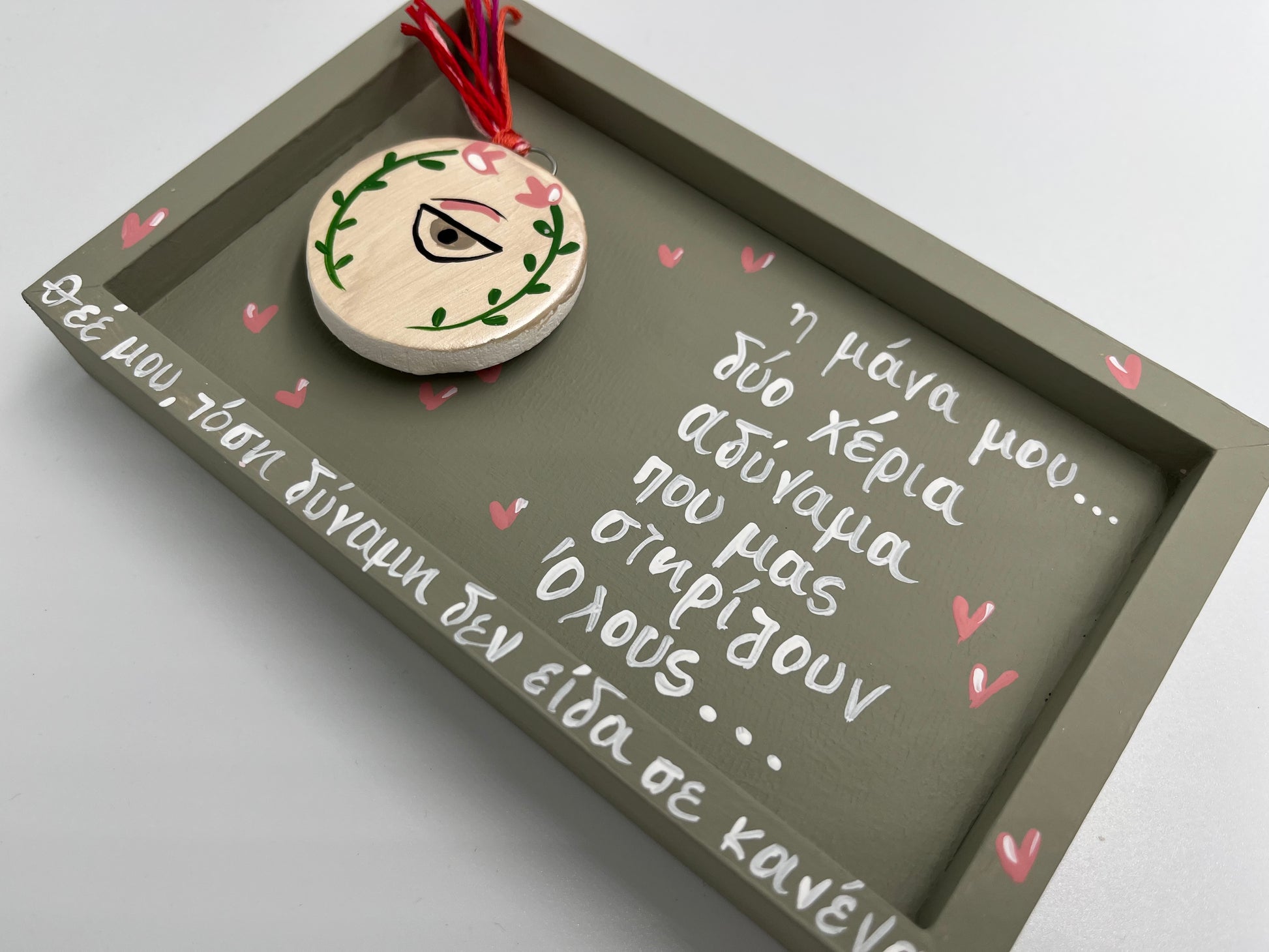 Ένα ξεχωριστό έργο τέχνης φτιαγμένο με αγάπη! Χειροποίητο ξύλινο καδράκι, ζωγραφισμένο στο χέρι με προσοχή στη λεπτομέρεια, που αποπνέει ζεστασιά και φινέτσα. Το πήλινο στοιχείο με το σύμβολο του ματιού προσθέτει μια ιδιαίτερη πινελιά προστασίας και θετικής ενέργειας. Ένα δώρο που εκφράζει ευγνωμοσύνη και αγάπη για τη μητέρα, ιδανικό για να στολίσει τον χώρο της και να της υπενθυμίζει πόσο μοναδική είναι!