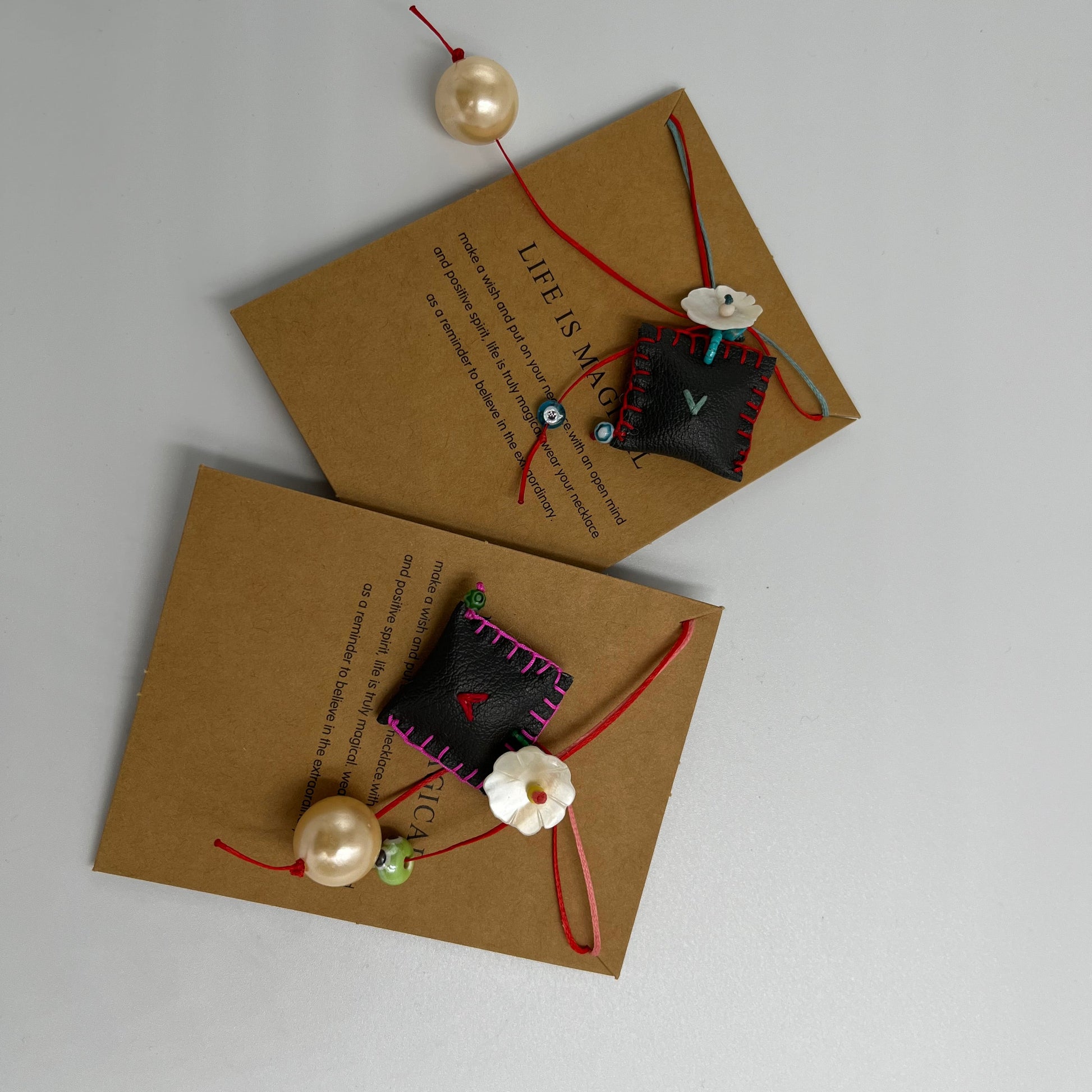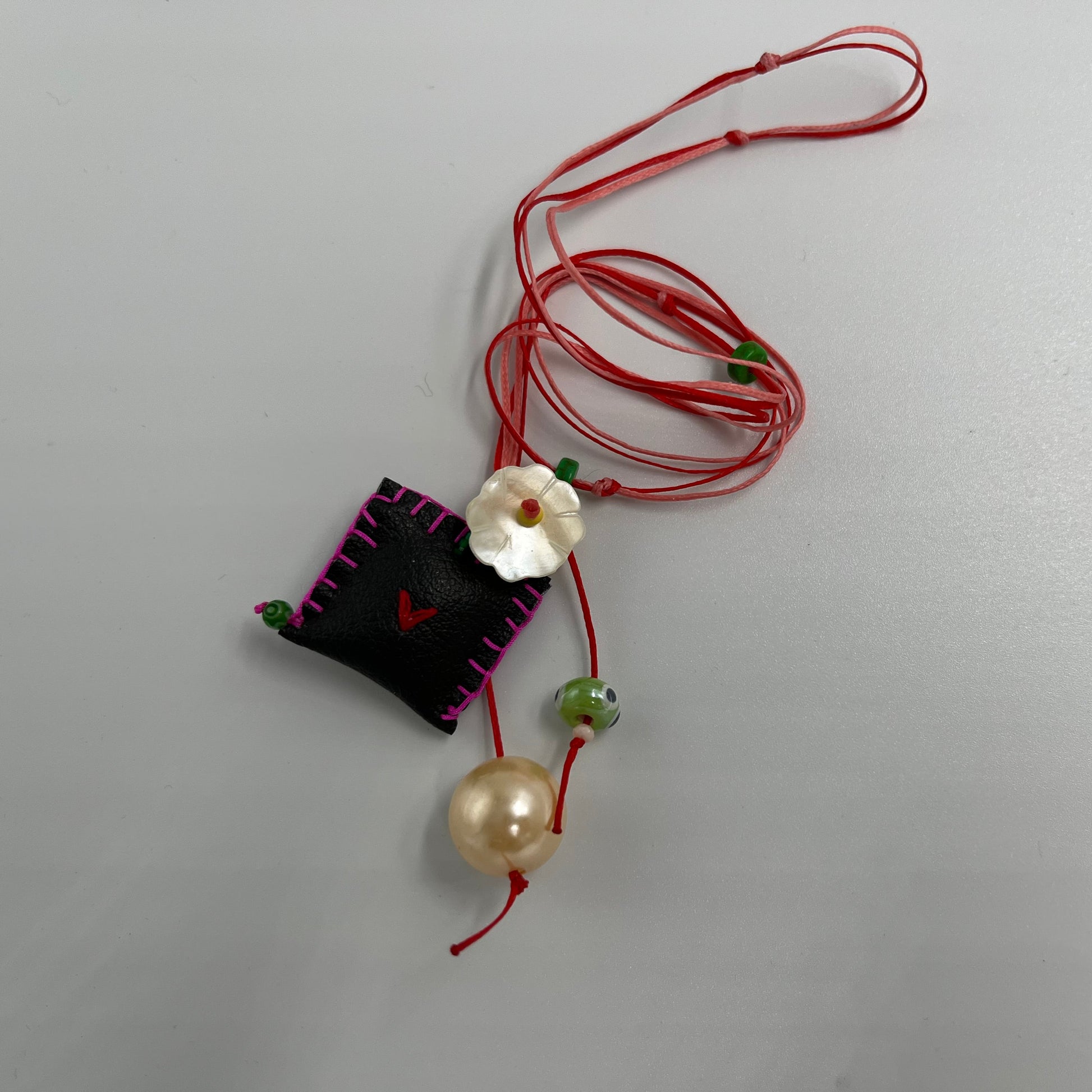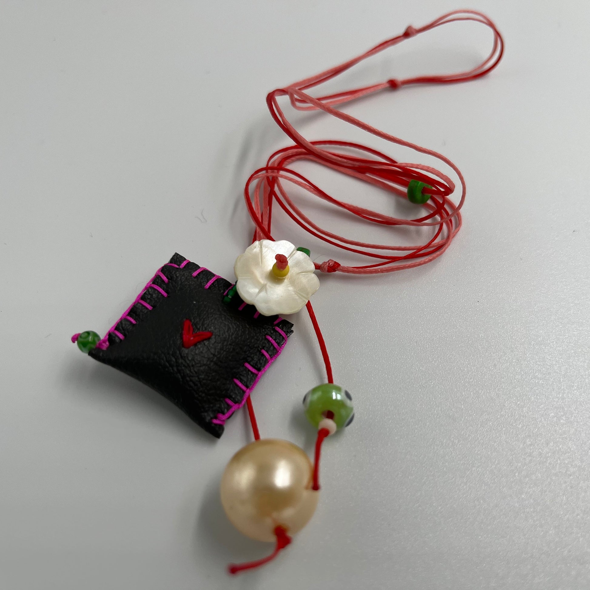 Ένα μοναδικό αξεσουάρ γεμάτο λεπτομέρειες και συμβολισμούς! Φτιαγμένο από οικολογικό δέρμα, αυτό το μακρύ χειροποίητο κολιέ ξεχωρίζει με το διακριτικό κέντημα καρδούλας, συμβολίζοντας αγάπη και ζεστασιά. Το λουλούδι από φίλντισι προσδίδει μια αίσθηση φυσικής ομορφιάς, ενώ η πέρλα και οι ημιπολύτιμες πέτρες προσθέτουν λάμψη και πολυτέλεια. Ιδανικό για γυναίκες που αγαπούν τη μοναδικότητα και την κομψότητα, αυτό το κολιέ είναι το τέλειο αξεσουάρ για κάθε περίσταση!
